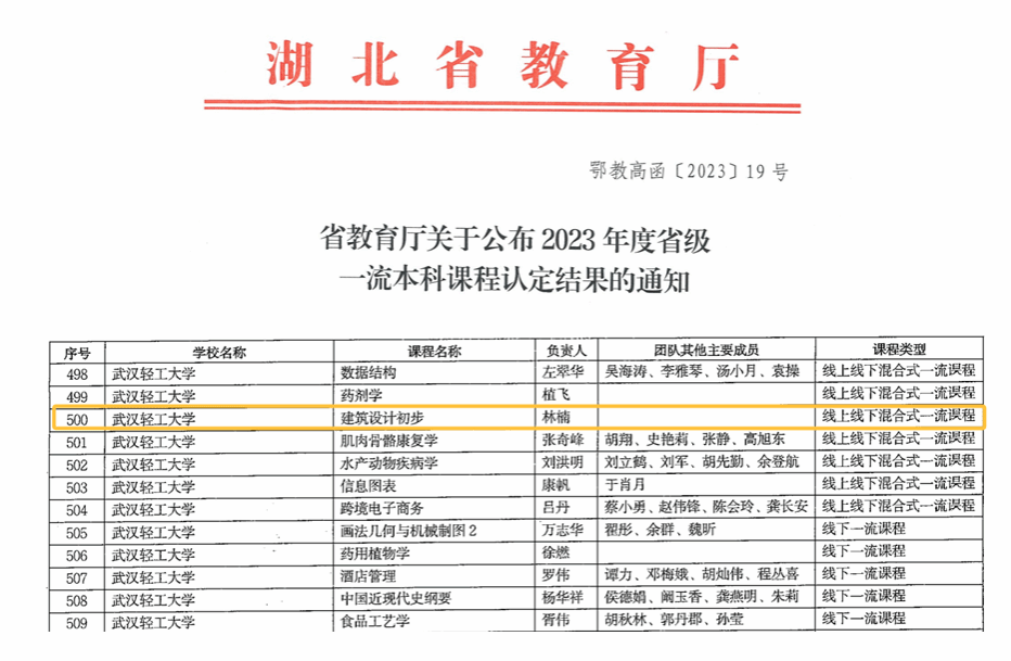 近日,湖北省教育厅发布《关于公布2023年度省级一流本科课程认定结果的通知》,我院建筑学专业核心课程《建筑设计初步》成功获批认定为2023年度省级一流本科课程。这一佳绩标志着我院在课程建设与教学改革方面取得了又一重要突破。
