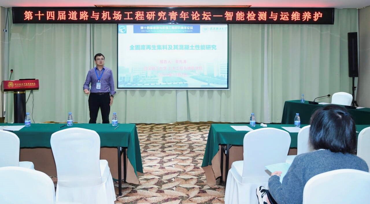 我院由刘杰胜院长带队,秦先涛副教授、张曼老师、付豪老师以及十余位研究生代表共同参会交流,并参与前期会议筹备分工、会场布置和对接联络重要参会嘉宾等工作。会上,秦先涛副教授做“全固废再生集料及其混凝土性能研究”的主题报告,介绍了学院团队在道路工程领域固废资源化利用的最新研究成果。