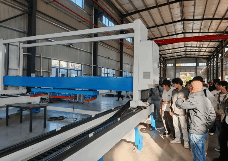 走进自动化生产车间,学生们近距离观摩了全自动轻钢构件生产线与CNC数控机床的作业实况。参观了智能制造设备如何实现从设计图纸到实体构件的一体化自动加工,了解了AI算法与工业机器人深度协同的数控加工的细节和建造流程。引导了学生思考新AI技术在建筑领域的应用,激发对工程行业的想象与热情。