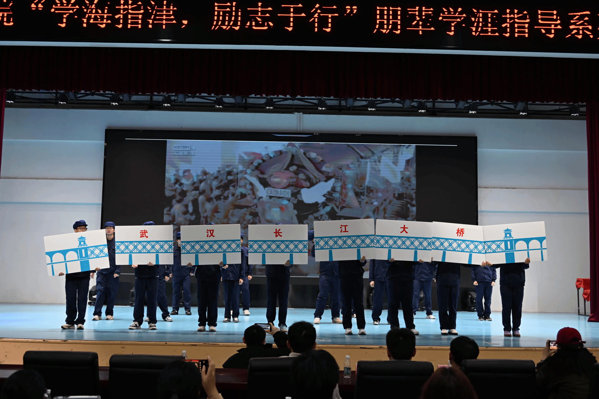 讲座分享环节,十位不同领域的优秀学生代表依次登台,从班团建设、学业发展、竞赛实践、学生工作、升学规划等维度,带来鲜活且实用的学涯经验:班团与学业标杆:校“十佳班级”代表建筑学2202班班长郑子暄分享班级建设的先锋经验,校“卓越之星”代表裴雅渲讲述学业精进的方法,国家奖学金获得者唐博欣(工程管理(中外)2301班)、国家励志奖学金暨保研代表建筑学2101班巴婧怡,分别拆解国奖攻坚与升学规划的核心逻辑。竞赛与实践先锋:全国“挑战杯”获奖代表建筑学2201班吴玉豪复盘竞赛备赛与攻坚的实战历程;“微光”暑期实践团队叶怡睿、“智启堵城·研创新篇”团队刘璐,分享用土建专业知识服务社会的实践故事。学生工作与成长榜样:院新媒体技术中心主任张彪,从学生干部视角剖析工作中的责任与能力提升路径;21级毕业生、中国地质大学(武汉)研究生周昶希,分享保研与学业规划的实操经验。2025年校“一二·九”团支部风采大赛一等奖获得者:智能建造2401团支部全体成员通过情景表演为全体人员展示了“桥魂薪火相传,智建青春担当”。