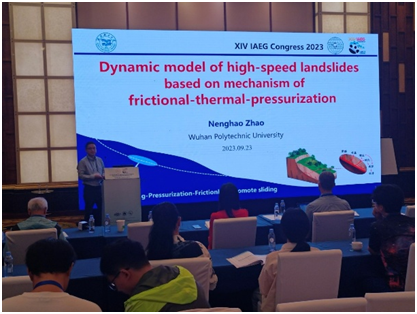 本学位点积极推动学术交流与合作,通过多种形式拓展师生学术视野。在国际交流方面,邀请3位海外知名专家来校举办专题学术报告,促进国际前沿研究动态的传播与交流。2023年9月,我院青年教师赵能浩老师带领研究生参加第十四届国际工程地质与环境大会,并在会上作题为“Dynamic model of high-speed landslides based on mechanism of frictional-thermal-pressurization”的英文学术报告,展示了我院教师在工程地质领域的创新研究成果(图7)。此外,学位点高度重视科研诚信与学术规范建设,组织开展科研诚信宣讲与专题培训5场,强化研究生的学术道德意识与创新能力,系统提升学术论文写作与学术交流水平。